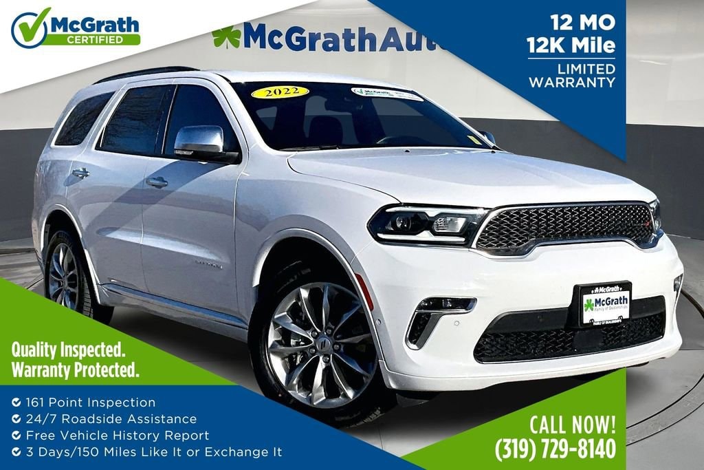 Discover the ultimate in style, power, and versatility with the 2022 Dodge Durango Citadel. This remarkable SUV is a true testament to Dodge's commitment to engineering excellence, delivering an unparalleled driving experience that will captivate your senses.Boasting a stunning exterior in a bold White color, the Durango Citadel commands attention wherever it goes. Under the hood, the HEMI 5.7L V8 engine with Multi Displacement VVT and 8-speed automatic transmission delivers an exhilarating performance, seamlessly blending power and efficiency with an impressive 14 city/22 highway MPG. 5.7L V8 (HEMI) with Multi Displacement VVT 19 HARMAN/KARDON Amplified Speakers with Subwoofer 825 Watt AmplifierThe Durango Citadel's premium features are designed to elevate your driving experience. Indulge in the luxurious Nappa/Axis II Seats with Rhombi Logo, enjoy the convenience of the Power Liftgate, and stay connected with the advanced Uconnect 5 Nav system and its stunning 10.1 display.Discover the unparalleled capability of the Durango Citadel's All-Wheel Drive system, which seamlessly adapts to any road condition, ensuring a confident and secure ride, no matter the weather or terrain. The Heavy-Duty Engine Cooling and Auto-Leveling Suspension further enhance the vehicle's performance, providing a smooth and responsive driving experience.This Durango Citadel is more than just a vehicle it's a statement of refined style and uncompromising capability. Certified by Dodge, this SUV has been meticulously inspected and comes with a comprehensive warranty, giving you the peace of mind you deserve.Prepare to be captivated by the 2022 Dodge Durango Citadel. Visit our showroom today and experience the power, luxury, and versatility that this exceptional SUV has to offer. We're confident that once you take it for a test drive, you'll be convinced that this is the perfect vehicle to elevate your driving experience.Prices may change at any time and are subject to availability and prior sale. Taxes, title, license fees, and a $180 documentation fee are not included. Payments shown are estimates; actual terms vary by buyer and credit approval. Dealer is not responsible for errors in pricing or vehicle details, information is believed accurate but not guaranteed. Photos are for illustration only confirm details with the dealer. Some vehicles come with a $1295 Clear Guard package. Fuel economy ratings and driving range figures are based on EPA estimates for new vehicles, and actual mileage and range may vary. By submitting your phone number, you consent to occasional SMS or calls about our products and promotions; standard messaging rates apply. See dealer for details. Fuel economy figures are official EPA estimates and clearly labeled as such.